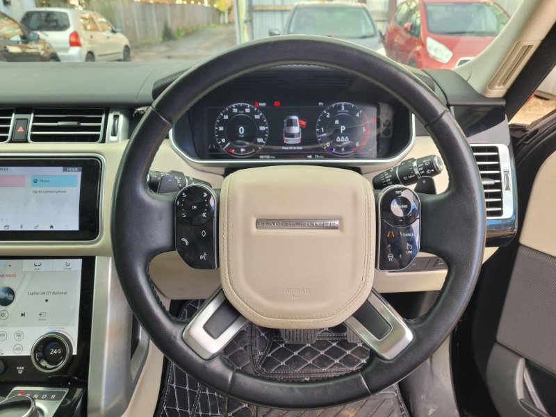 This 2019 Land Rover Range Rover SD V6 Vogue boasts a full service history and has had only one owner from new. This Euro 6 compliant vehicle features a powerful 3.0L diesel engine paired with a four wheel drive drivetrain, offering a towing weight of 3500 kg. You can drive with confidence knowing it comes with a 12 month MOT and a 3 month warranty. Inside, you will find luxurious 20 way heated front seats with power recline, complemented by heated rear seats and memory function. Enjoy your journeys with the premium Meridian Sound System and the expansive fixed panoramic roof.